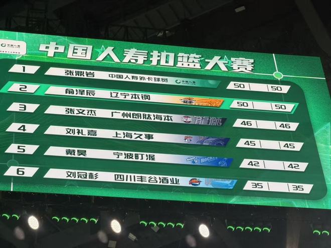 第1位出场的是刘礼嘉第一次扣飞,随后完成大风车暴扣获得50分满分,两次扣篮合计95分。